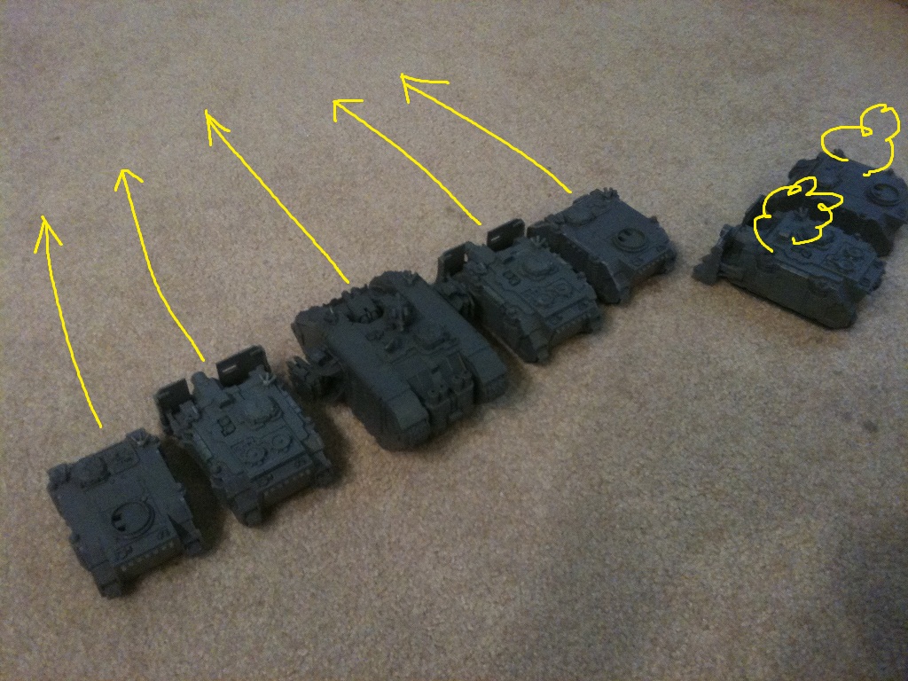 Before you look at this and give up, read what I have to say carefully. Over here you'll see the armored column of vehicles rush into the fray while leaving Predators in the back as supporting fire. If the enemy is dead ahead, the return fire will be funneled into 2 realistic scenarios: Your opponent is forced to shoot at AV13 front, shooting through 50% of the vehicles so I get cover, or doing both of those.